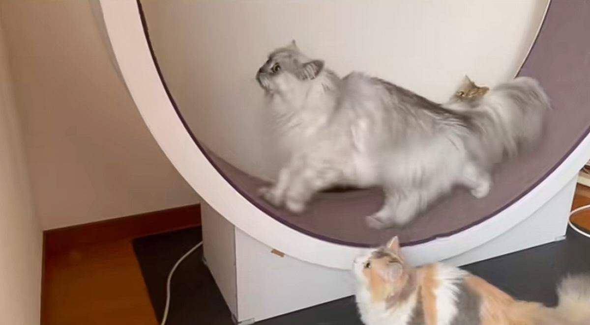 キャットホイールで走っていると、『小さな猫』が乗ってきて…尊いやり取りの瞬間が23万再生「サイズの違いが可愛い」「頑張ってるね」