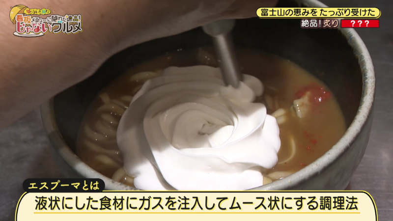 エスプーマとはスペイン語で「泡」という意味。液状にした食材にガスを注入することでムース状にする調理法です。スパイシーなカレーとしっかりと混ぜていただきます。