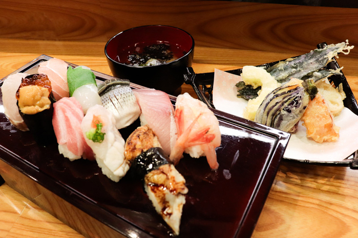 握り10貫、金時草や太きゅうりなどの加賀野菜天ぷら、味噌汁がつく、石川県の地物が味わえる、お得なセットです。厚切りのネタが口の中でとろけて、贅沢な旨味が広がります。