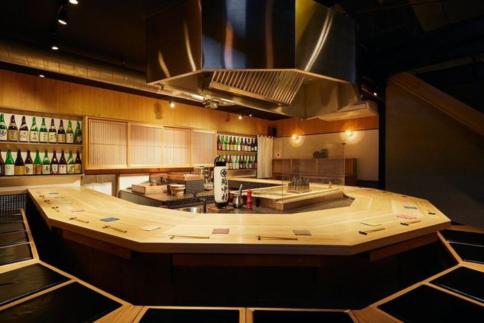 店内には、調理の迫力あるライブ感を楽しめるコの字型のカウンター席があり、パチパチと炉端で焼き上げる原始焼き、巧みな技で握るお寿司など、五感で楽しませてくれます。