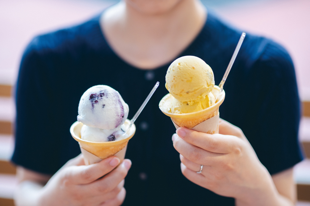 おすすめはブルーベリーをたっぷり使用した、みるくべりー・かぼちゃあいす 各250円。