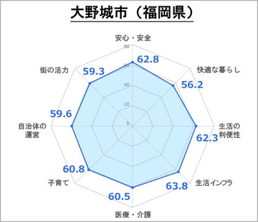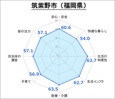 福岡県の4つの市のグラフを見てみますと大野城市は生活インフラ、春日市・筑紫野市は医療・介護、宗像市は快適な暮らしが高く評価されており、自治体によってカラーが異なるという興味深い結果が浮き彫りとなりました。