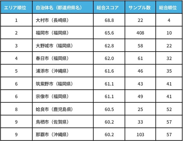 また、大東建託の調査した「住みたい街ランキング全国版」で福岡市は1位、「住みたい街ランキング都道府県版」で福岡県が2位を獲得し、圧倒的な強さを確認できていたのですが、シティブランド・ランキング「九州・沖縄エリアランキングTOP10」でも同様の結果を得たといえそうです。