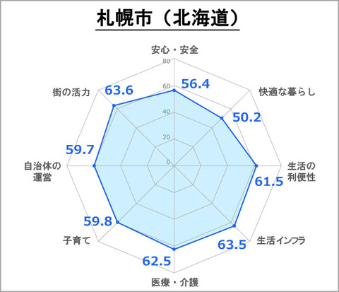 札幌市は39項目中「応援できる文化・スポーツ団体がある」が66.7スコアと最も高く、福岡市同様、8分野の中で、街の活力が最も高く評価されました。