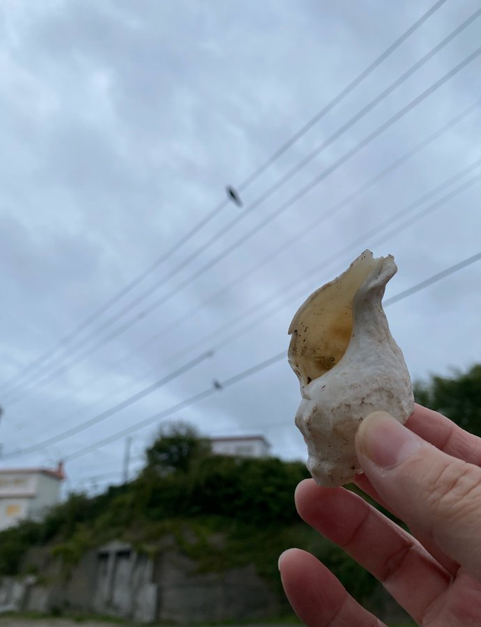2025年10月12日の投稿では、電線に止まったカラスを背景に撮影された、1つの貝殻を紹介している。