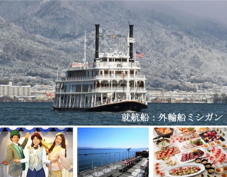 土日祝日と年末年始(12月27日~1月4日)に大津港から運航されるのは、びわ湖の代表格「外輪船ミシガン」です。最上階デッキからの景色はもちろん、本格的な料理や音楽ライブも楽しめるエンターテイメントクルーズ船です。コースは60分コース(大人2,600円、小学生1,300円)と90分コース(大人3,200円、小学生1,600円)から選べます。※2026年2月7日~3月1日はミシガンの定期点検のため、客船ビアンカにて運航されます。