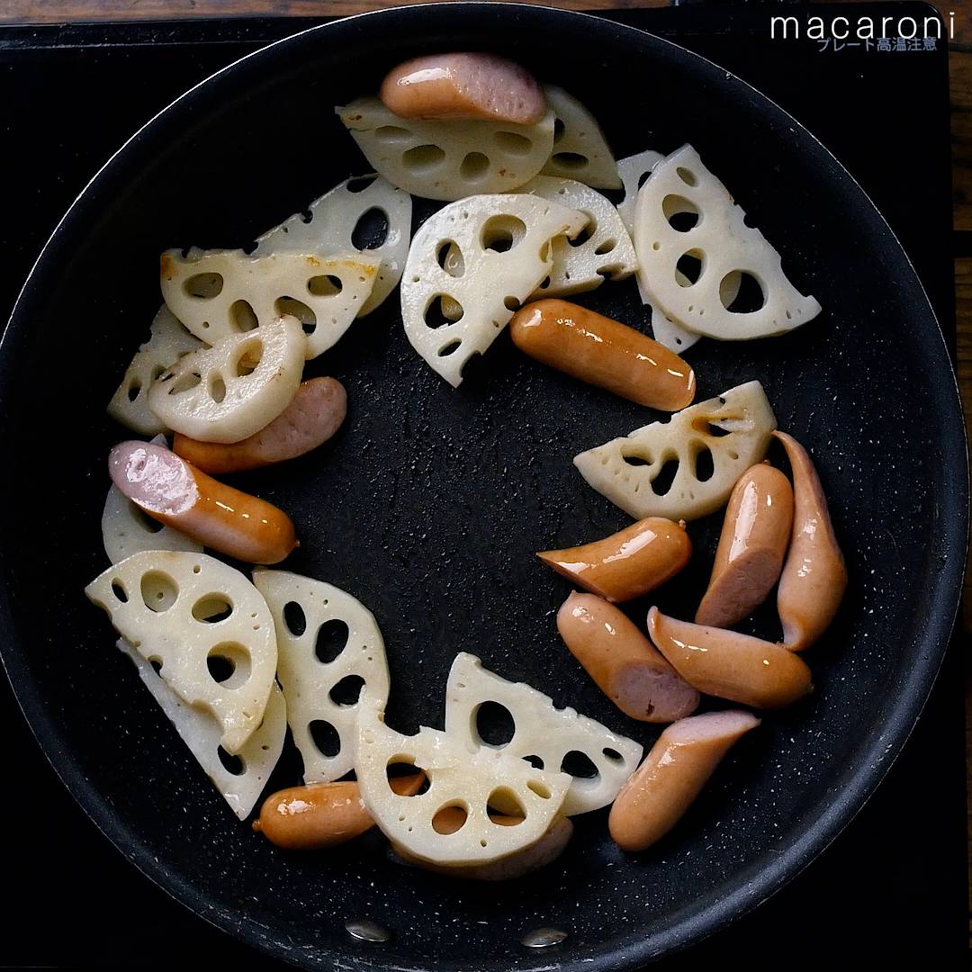 2: フライパンにオリーブオイルを引いて中火で熱し、ソーセージ、れんこんを入れて炒めます。