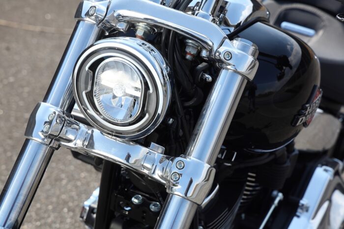 従来の楕円型LEDライトからベーシックな丸いLEDライトに変更された。ポリッシュされたトリプルツリーと丸いライトが織りなす表情にハーレーらしさを感じる人も多いのでは!?