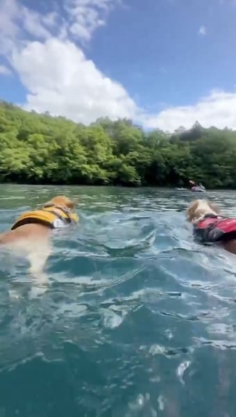 画像撮影後はりのきやさんの隣に座っている妻さんも湖へ飛び込み、1人と2匹で仲良く泳いだとのことです。