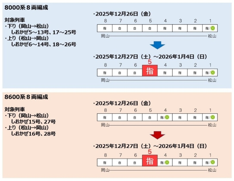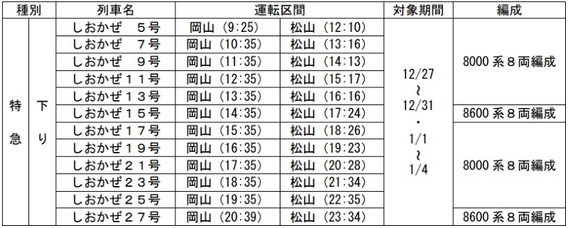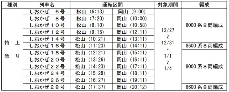 JR西日本・JR四国は、年末年始の帰省シーズンに合わせ、全編成岡山駅発着で運転する予讃線の特急「しおかぜ」の指定席を拡大。実施期間は2025年12月27日(土)~2026年1月4日(日)までの9日間。
