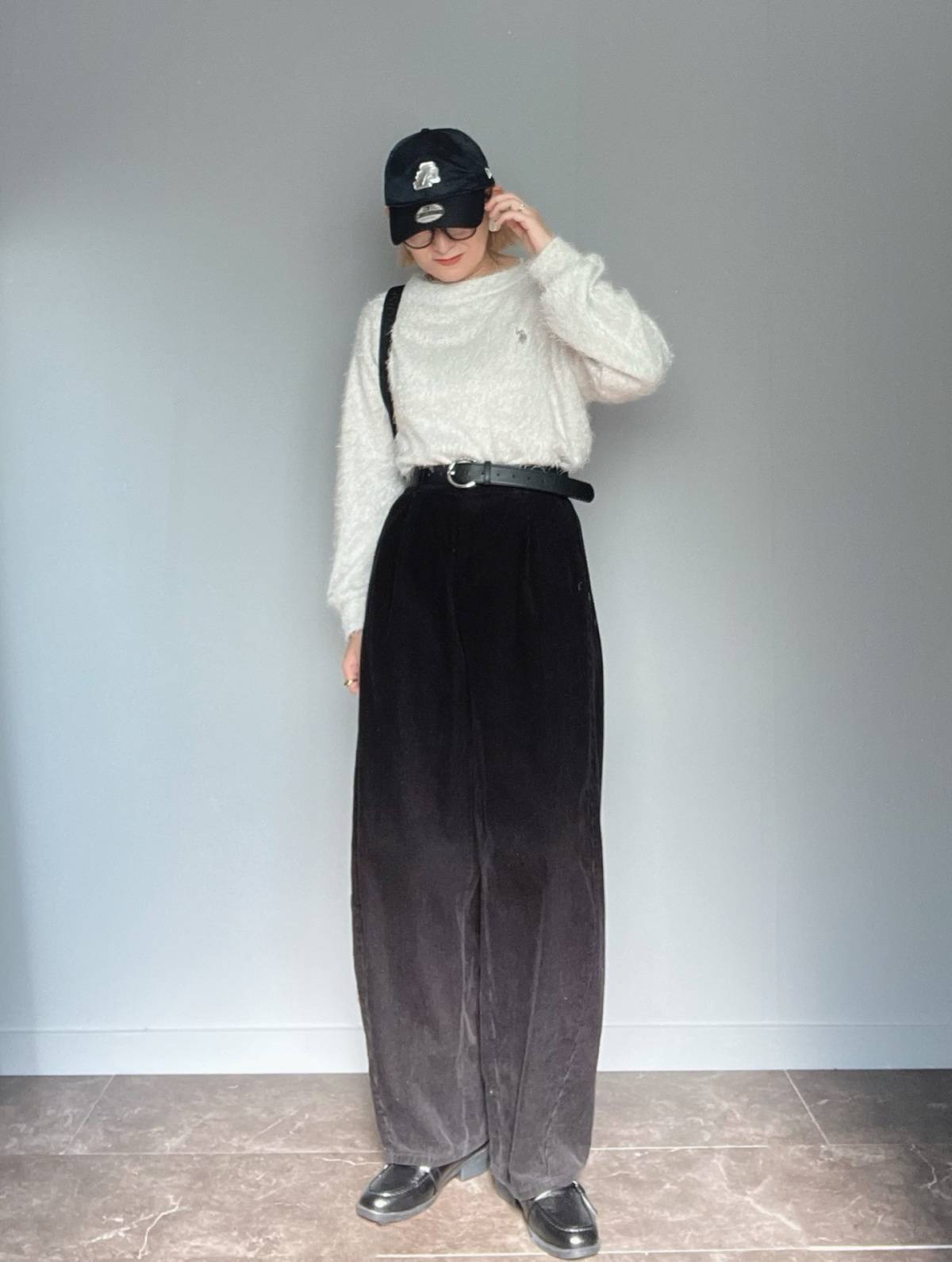 あたたかみがあって12月にピッタリなシャギー素材の白ニットには、ワイドシルエットの黒パンツを合わせると◎