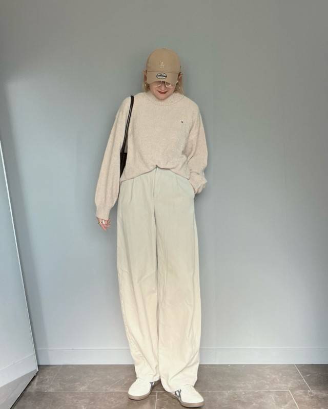 寒い日が続く12月だったら、ベージュのニットに白パンツを合わせたスタイルが◎