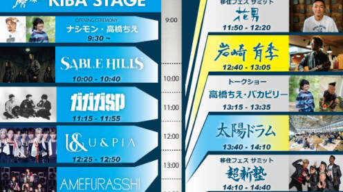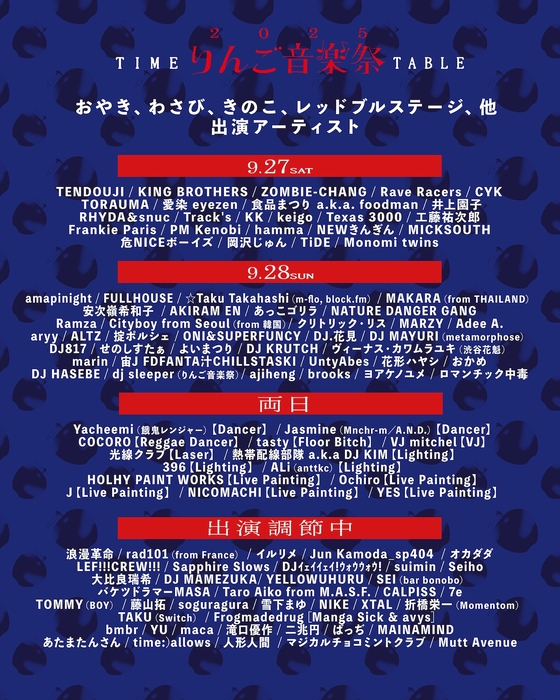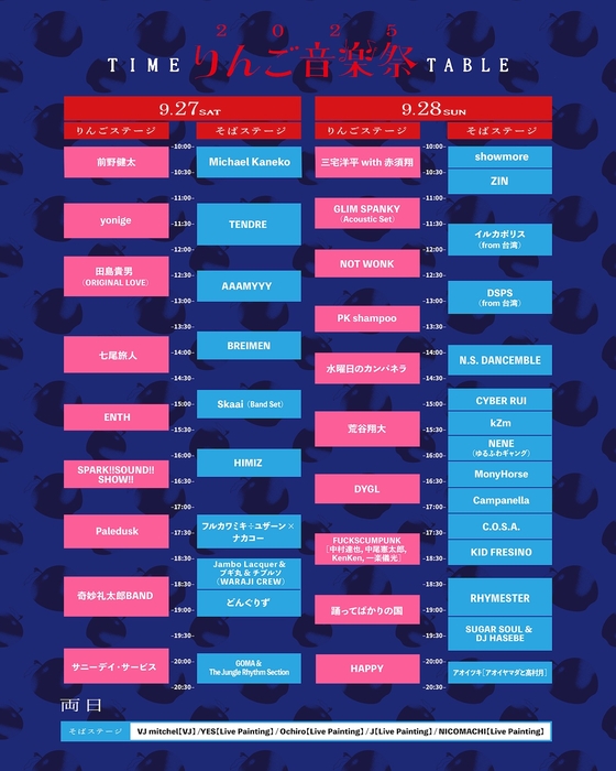 第11弾発表に伴い、りんご音楽祭公式HPにてりんごステージ・そばステージのタイムテーブルが公開された。そのほか、一部出演アーティストの出演日程も公開中。全タイムテーブルは後日発表される。今後も続くアーティスト発表にも注目しよう。