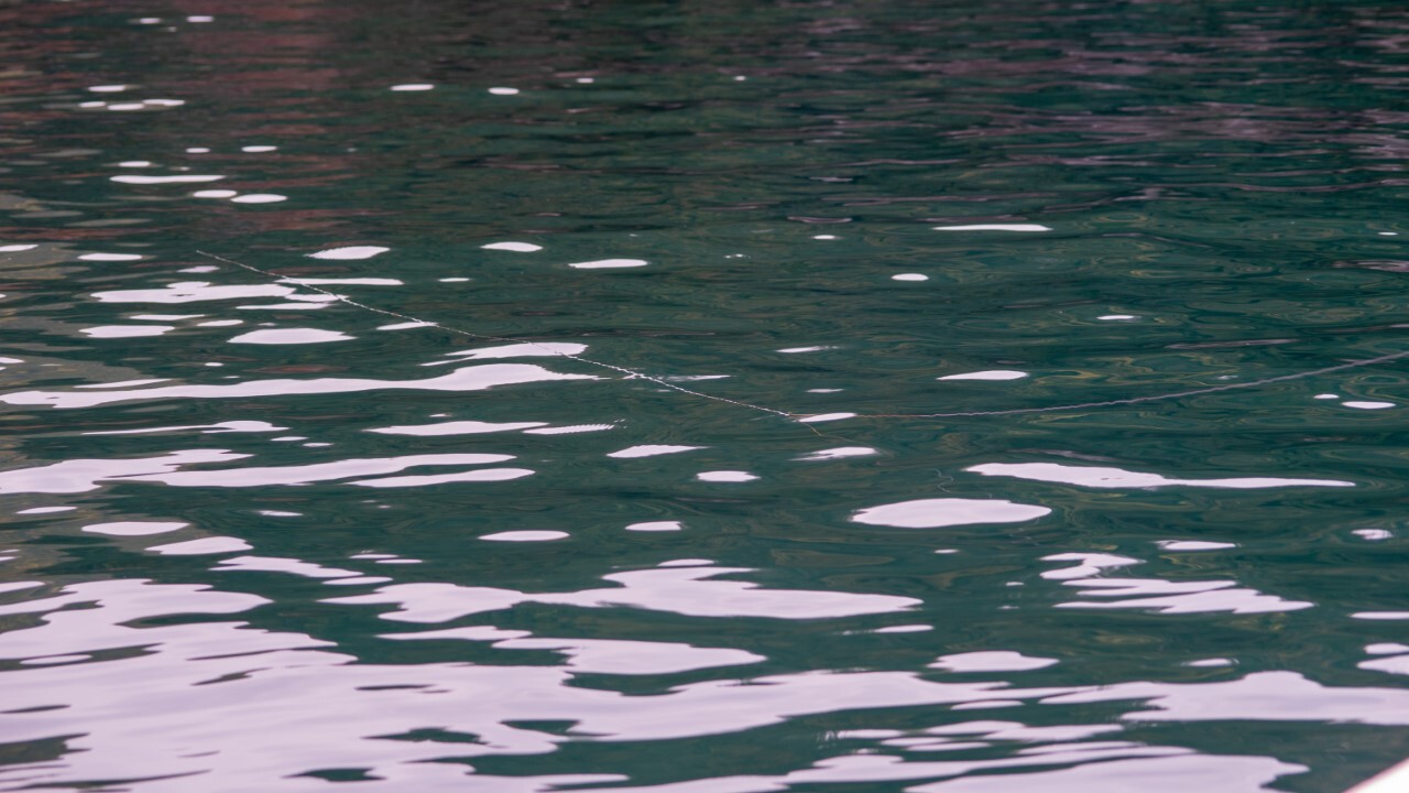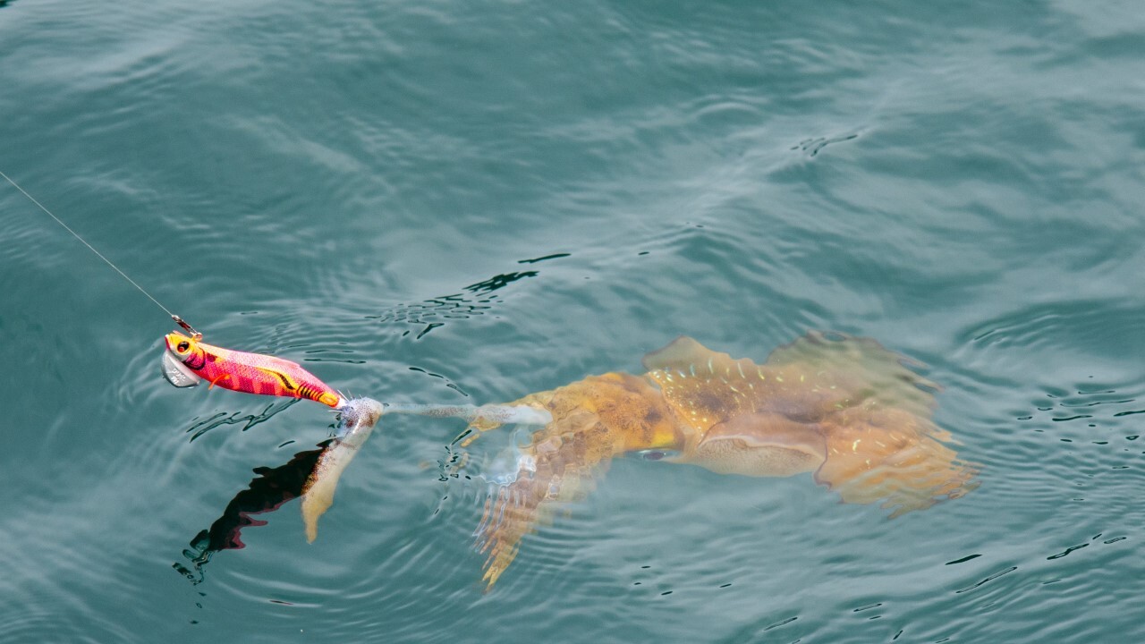 日中はエギそのものを偏光グラス越しに見ながらも、海面付近に浮いているラインも見ていましょう。海面のラインがゆっくり引き込まれていればエギがフォールしている最中ですが、ラインが途中で止まる、あるいは弾かれるように「ツンッ!」となれば、それはアオリイカがエギを抱いた、あるいは触腕でエギを触ったシグナルですので、聞きアワセではなくしっかりとロッドを立ててカンナを身に刺すようにアワセを入れます。