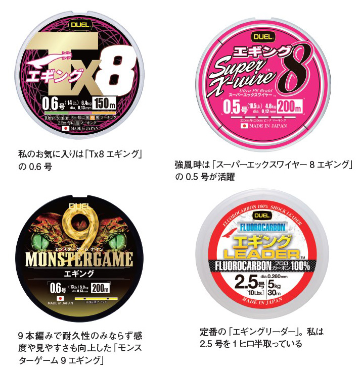 PEラインで気になるのは、8本編みか、4本編みかといった点だと思いますが、エギングの場合、基本的にガイドの抜けや通りもよく使いやすいのは8本編みで、個人的には「Tx8エギング」の0.6号を愛用し、風が強くどうしてもラインが抵抗になる時のみ「スーパーエックスワイヤー8エギング」の0.5号に変更しています。9本編みの「モンスターゲーム9エギング」もまっすぐに伸びた芯の存在により、耐久性、耐摩耗性、感度、操作性がさらに向上し、見やすい黄色のラインに1m毎に黒のマーカーが入りアタリが取りやすくなっていますので気になる方はぜひ使ってみてください。