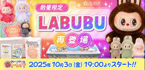 サイバーステップ株式会社が運営するオンラインクレーンゲームアプリ『トレバ』において、『LABUBU(ラブブ)』のぬいぐるみが数量限定で再登場いたします。