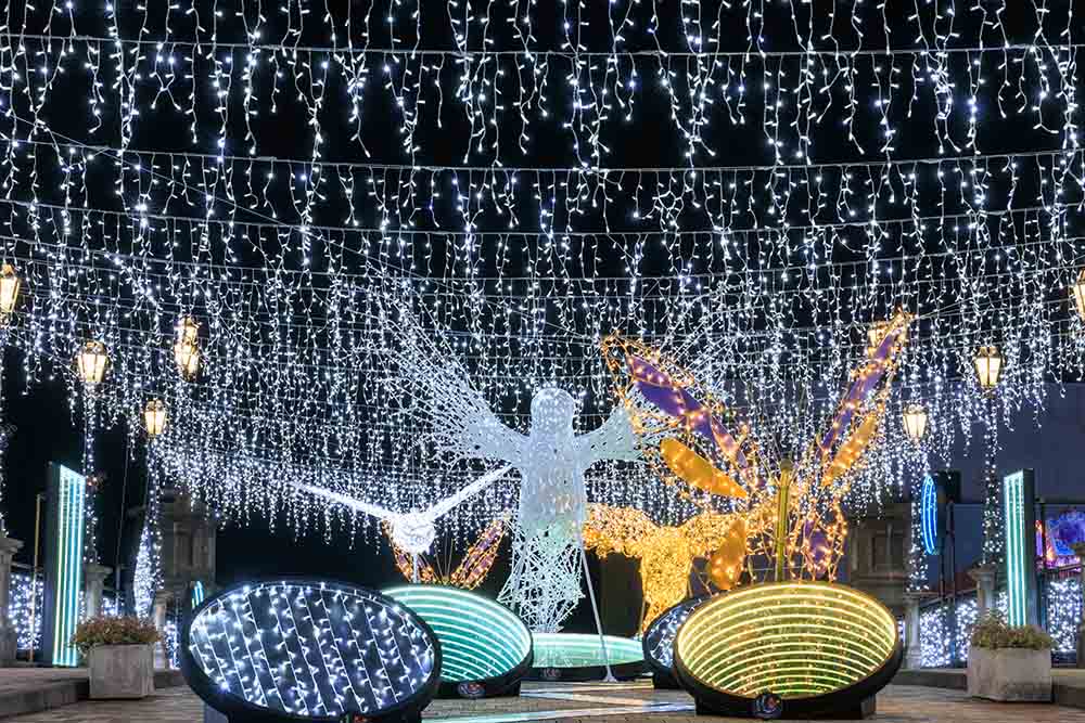 ゲートをくぐると、2024年より高さを増した18mの巨大クリスマスツリーや、光と鏡が織り成す幻想的なブリッジ、ヨーロッパの街並みを彩る光の絶景が広がります。