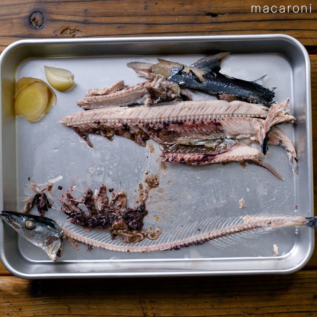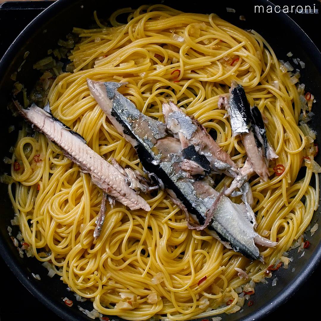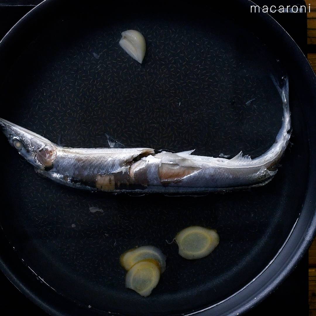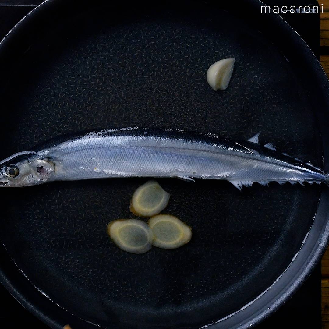 1: フライパンに湯を沸かし、酒を入れます。さんま、にんにく、しょうがを入れて10秒経ったら、火をごく弱火にして3分加熱します。