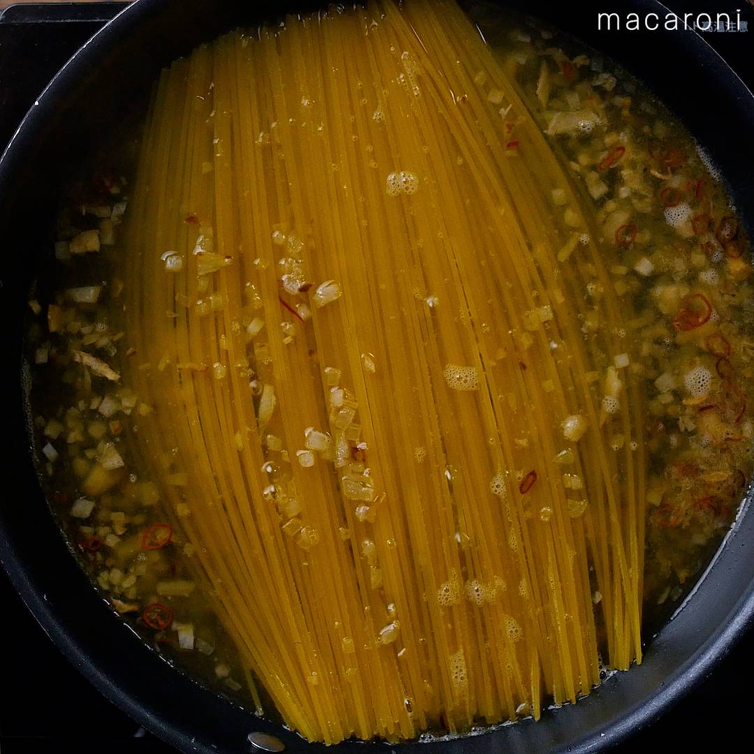5: だしの素、水を入れて沸騰させてスパゲッティを入れます。