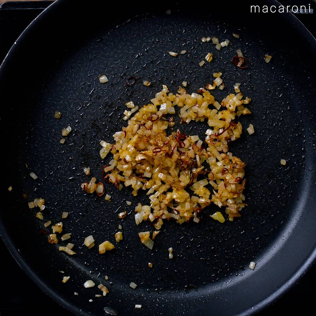 4: フライパンにごま油、にんにく、しょうが、輪切唐辛子、玉ねぎを入れて炒めます。