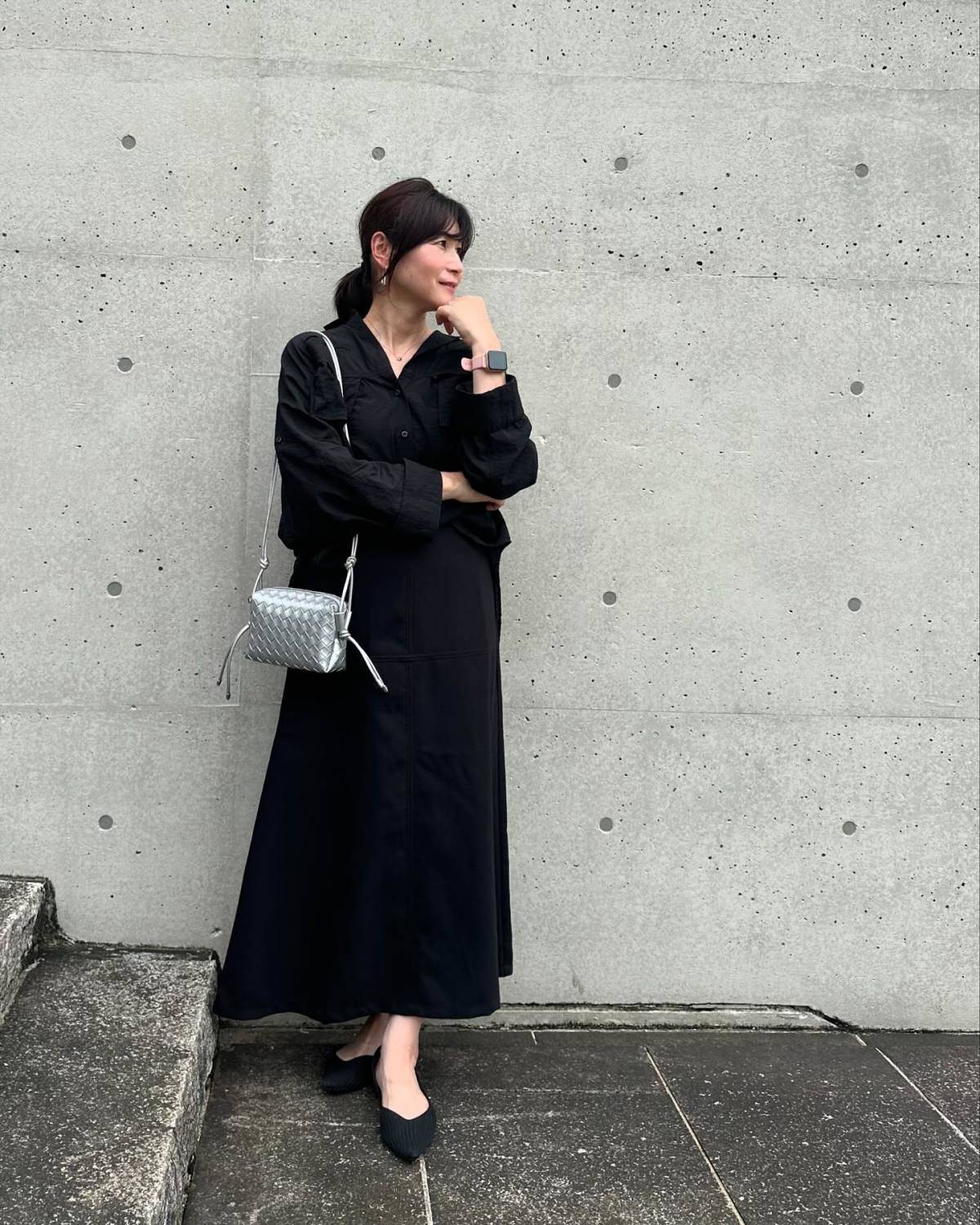黒シャツと黒スカートのオールブラックコーデはワンピース1枚よりもメリハリが出て、スタイルアップ効果を期待できるのが嬉しいですよね♡