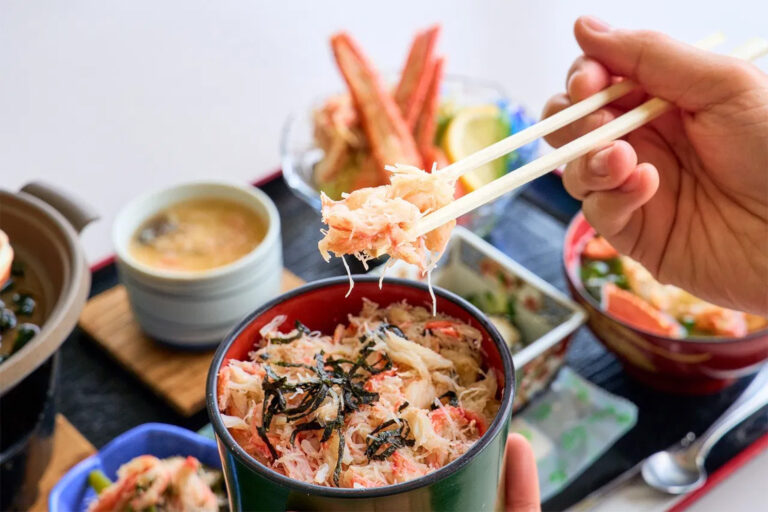 佐渡産紅ズワイガニの『カニ御膳』の目玉は、焼いた紅ズワイガニのほぐし身をカニ味噌にからめて味わう一品。口いっぱいに広がる幸せなカニの風味が楽しめます。そして、カニの炊き込みご飯は、カニのうまみをたっぷり含んだ炊き込みご飯にこれでもか!というほど、カニのむき身がのっています。