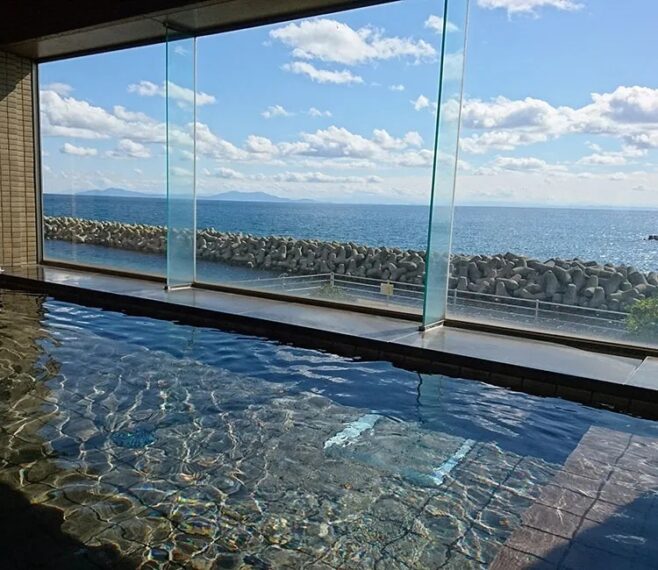 『カニ御膳』を満喫した後は、日本海を望む展望風呂でリフレッシュ。サウナもありますよ。