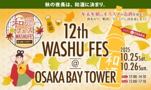 地方創生を応援する和酒フェス大阪実行委員会は、「第12回 和酒フェス@大阪ベイタワー」を10月25日(土)、26日(日)に、大阪環状線と大阪メトロ中央線の「弁天町駅」に直結する大阪ベイタワー2F・アトリウム広場(大阪市港区)で開催いたします。