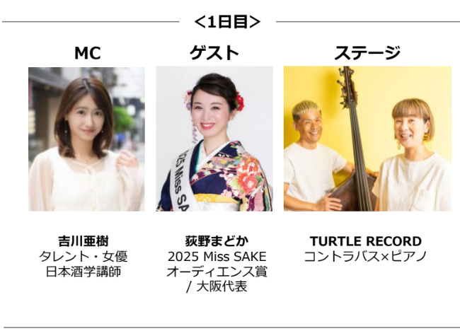 ゲストには、1日目は2025 Miss SAKE 大阪代表 / オーディエンス賞の荻野まどかさん、2日目は2025 Miss SAKE 準グランプリの堀越はなさんが和服姿で会場を彩ります。
