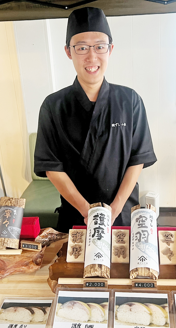 今年7月にオープンした「鯖ずし小森」(三重県伊賀市四十九町)の店長。「鯖ずしをもっと身近に」を掲げ、昔ながらの製法で一品一品を丁寧に届けている。