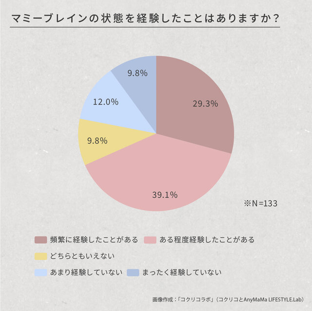 次に「マミーブレインの状態を経験したことがあるか」を聞いたところ、「頻繁に経験した」「ある程度経験した」を合わせたママが約7割で、「まったく経験したことがない」と回答したママはわずか1割でした。「マミーブレイン」という言葉自体を聞いたことはなくても、多くのママが困難を経験していることが明らかになりました。