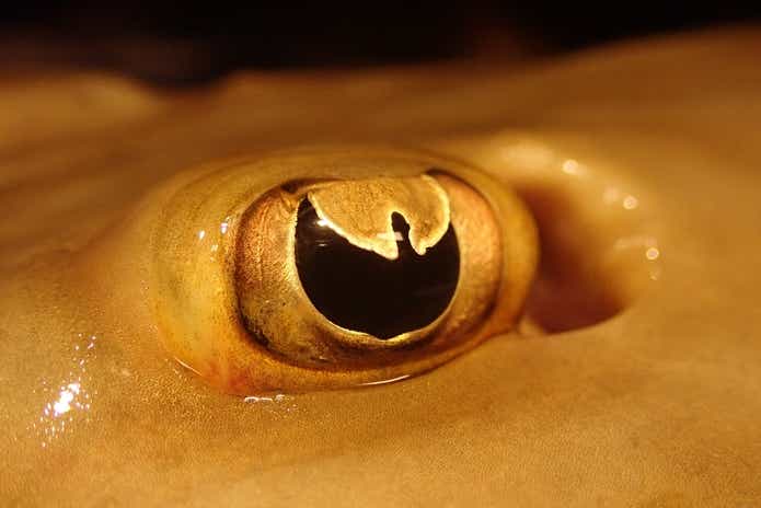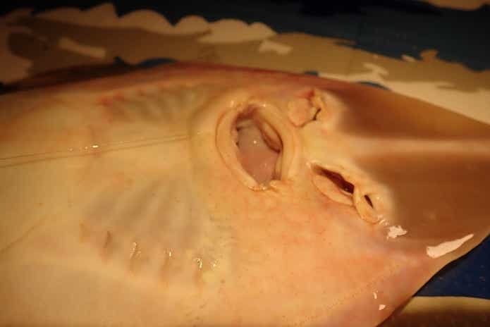 サカタザメは、鰓孔(魚で言う鰓蓋)が魚体の裏側にあるのでエイの仲間になります。
