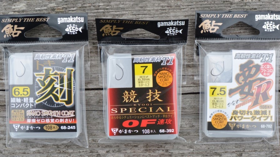 ハリは4本イカリで、この日出番があったのは、T1 刻6.5 号、T1 競技SP OF(速攻)7 号、T1 要R7.5 号(すべてがまかつ)。T1 刻は掛かりと根掛かり回避のバランスがよくどのポイントでもパイロット的に使用。T1 競技SP OF(速攻)はハリ先がストレートで刺さりが早い。岩盤での縦の釣りと泳がせを試すときに登板。初期特有の若アユの身切れ対策には太軸のT1 要Rの7.5 号へスイッチ