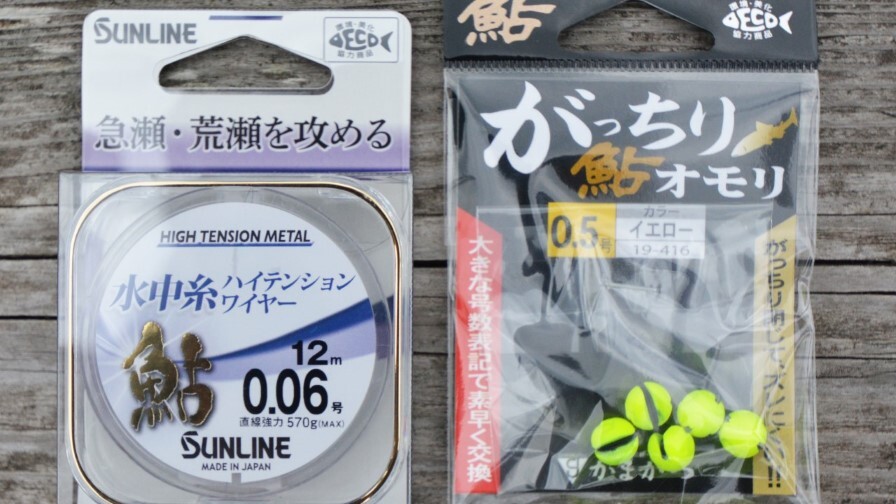 水中イトはハイテンションワイヤー0. 06号(サンライン)。流れが湧き上がっているような岩盤沿いではがっちり鮎オモリ0.5 号(がまかつ)を打つこともあった。