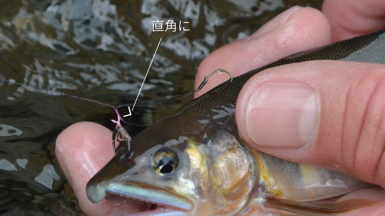背バリを打てばオトリは前傾姿勢となりそれが潜らせやすいメリットを生むが、前傾姿勢になりすぎても反応が悪くなるため、なるべく水平に近い姿勢で引きたい。そのためテンションを掛けたときに、ハナカンと背バリが直角になる位置に打つのが下田流だ。正中線上に打つのが基本だが、それでも傾いてしまうオトリもいる。その場合は、姿勢が立つ位置を探って打ち直す。ルアーフィッシングのトゥルーチューンにも通じるコツだ。
