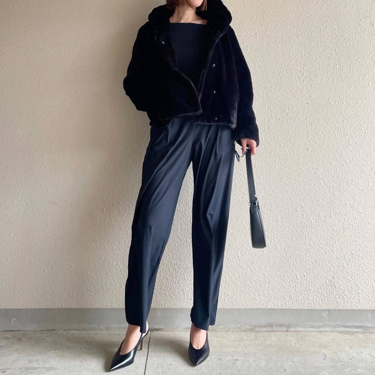 【11月編】老け見えしない黒パンツコーデ③ボアアウターやヒールで今っぽさをプラス!