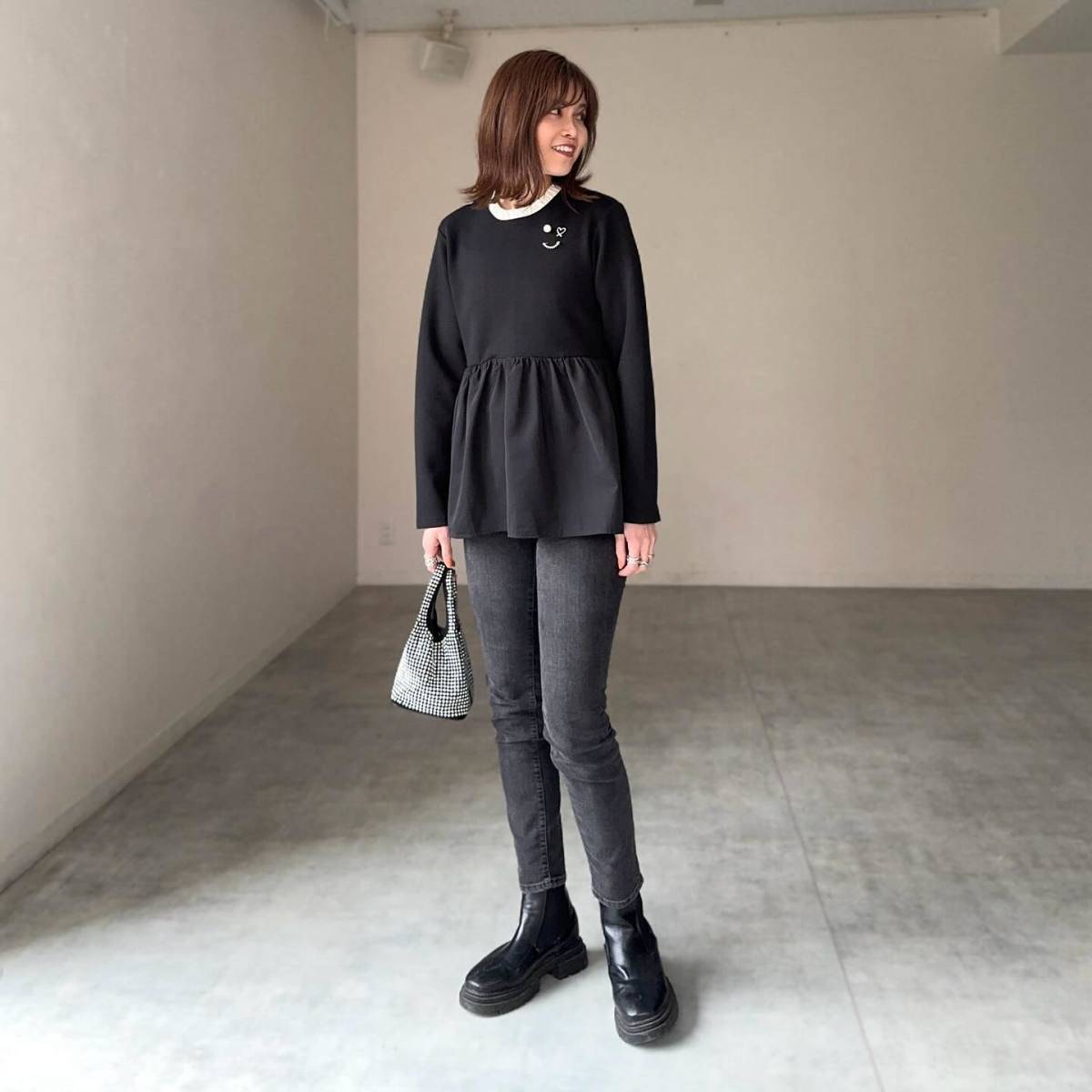 【11月編】老け見えしない黒パンツコーデ①ペプラムトップス×デニムパンツ