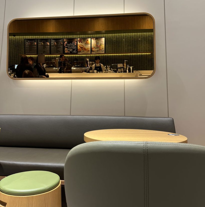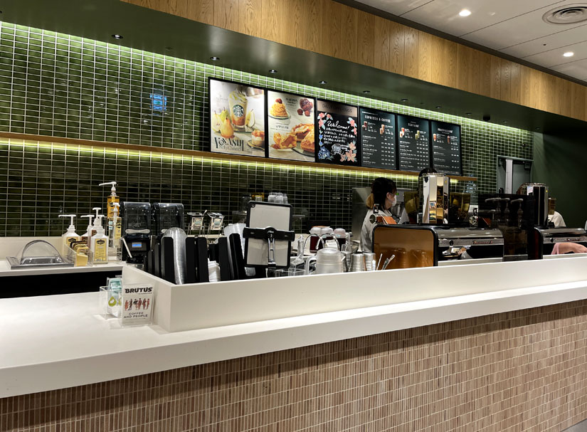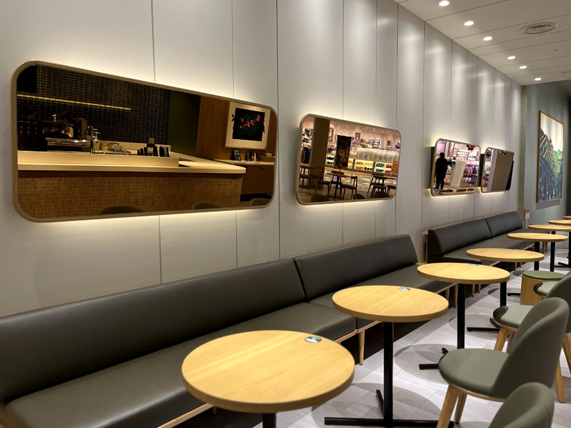 「イオンモール須坂」店舗ではミラーウォールを採用。1階はミラーを通じてバリスタがコーヒーを淹れる様子も楽しむことができます。