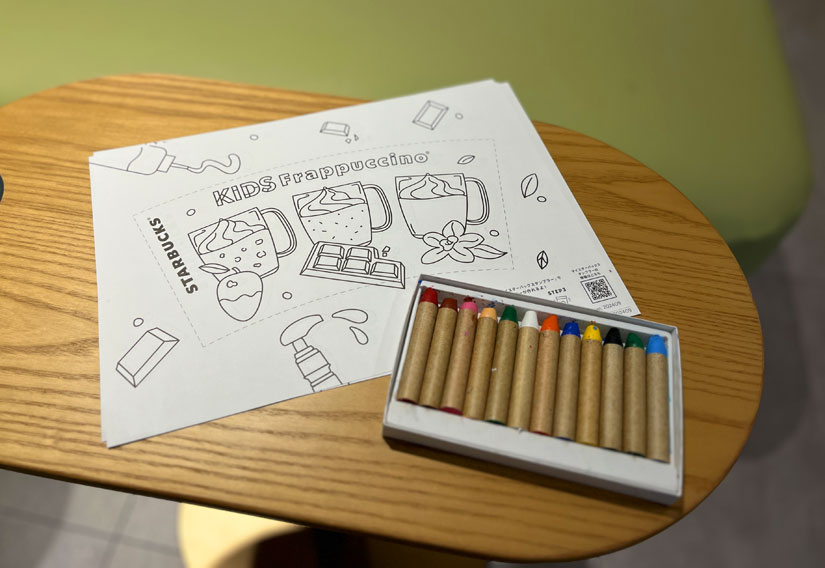 キッズ コンディメントバーには「キッズ フラペチーノ®」をモチーフにした塗り絵も置いてあり、子どもとゆっくりカフェ時間を過ごすことも。さらに、この塗り絵は「マイスターバックスタンブラー」(355ml/1800円)に差し込みオリジナルデザインのタンブラーを楽しむことができます。