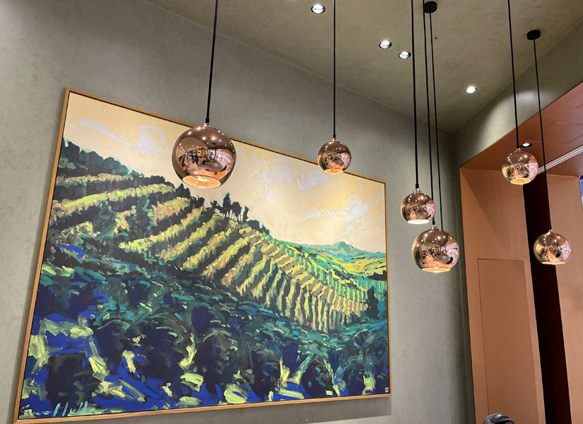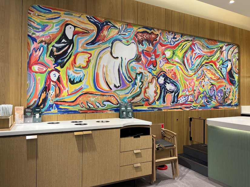 壁のアートは、コスタリカにある「スターバックス」の自社農園を描いたもの。コーヒーチェリーをイメージした照明を合わせています。