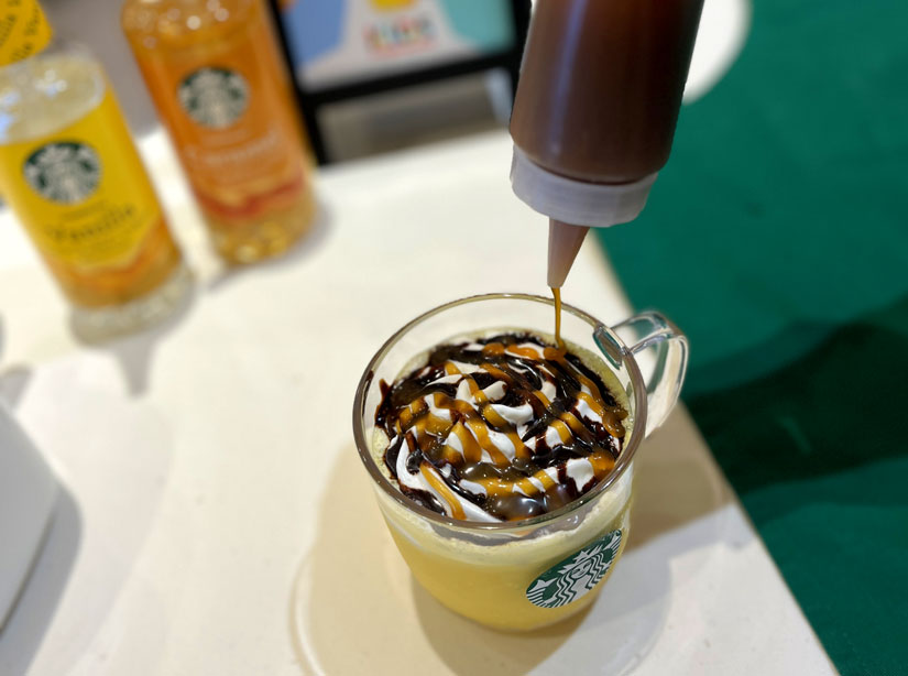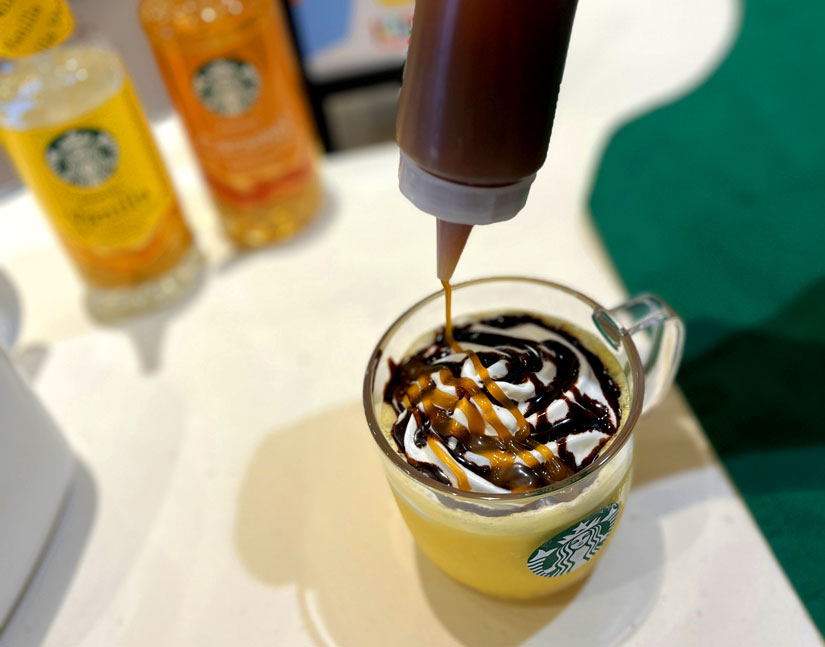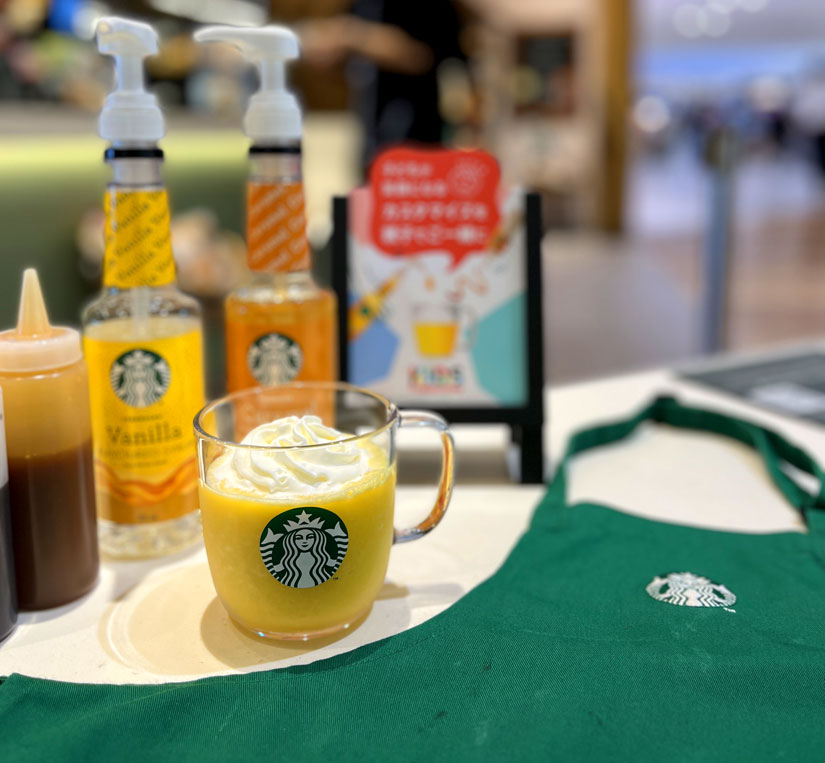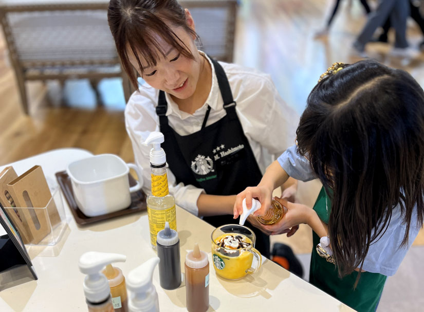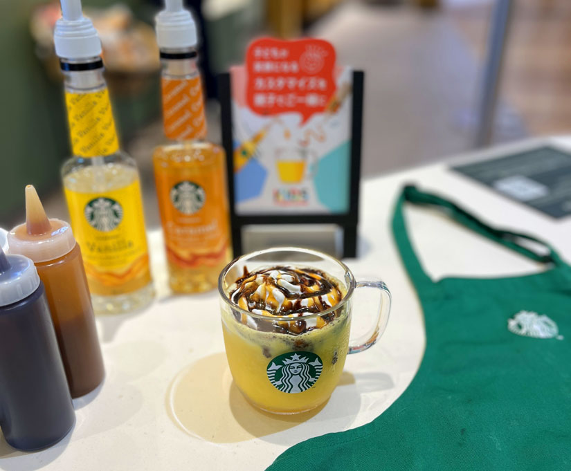 カスタマイズ体験では、チョコレートソース・キャラメルソース・キャラメルフレーバーシロップ・バニラフレーバーシロップを子どもたちが自分で加えたり、デコレーションすることができます。「スターバックス」のキッズエプロンを着用することも♪