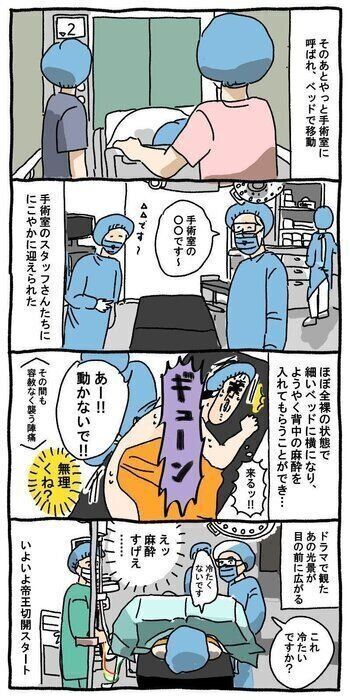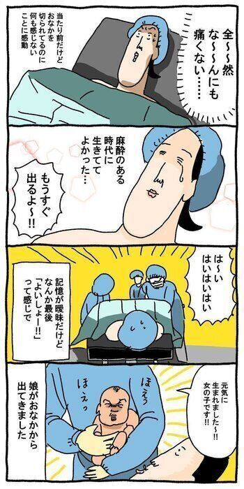 麻酔入れたら陣痛もスーッと無くなって、なんか氷みたいなのをおなかに当てられたけど、何当てられたかわからんぐらい感覚無くなって、ただただ「すげえ」だった。