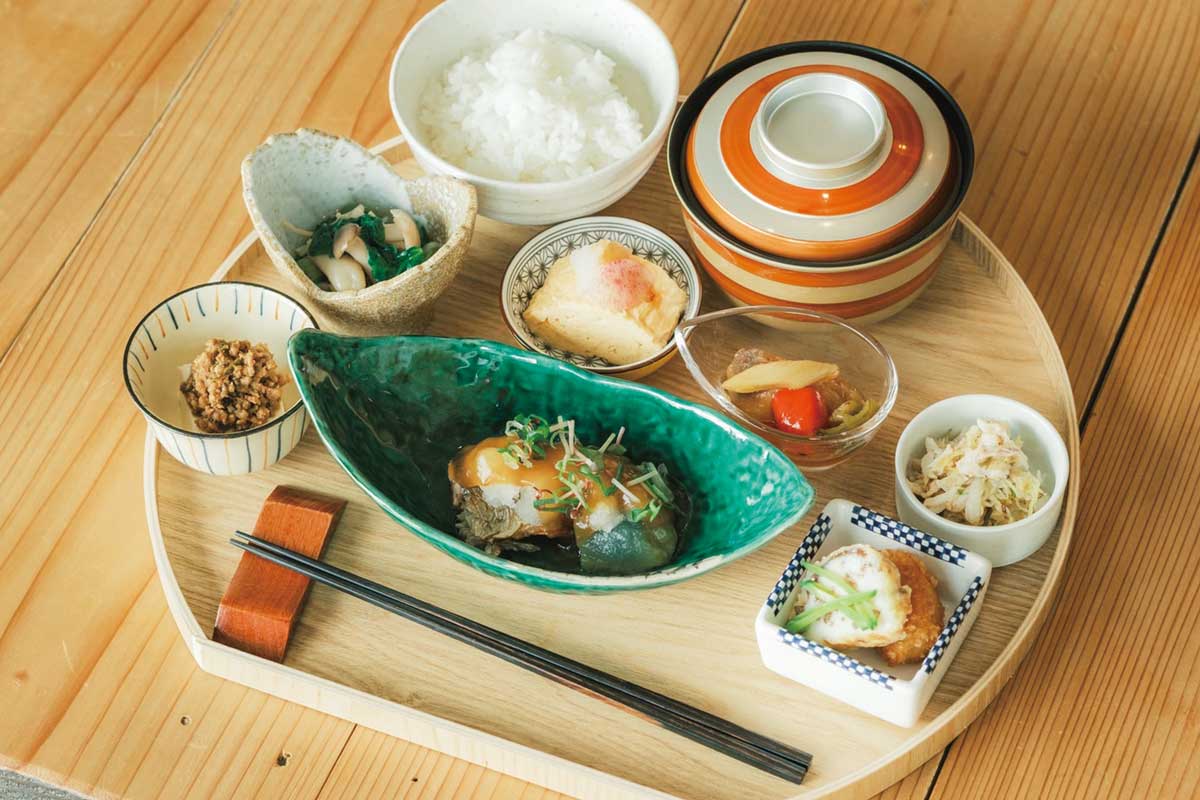 和食コースを一つのお盆にのせた「ランチメニュー」は、毎朝本店の土鍋で炊き上げた白米「にじのきらめき」と汁物、小鉢は6種類のラインナップ。メインのおかずは、本店の仕入れ状況や食材の旬で変わります。