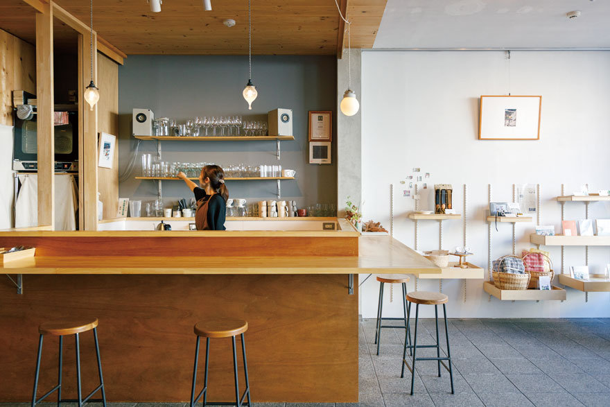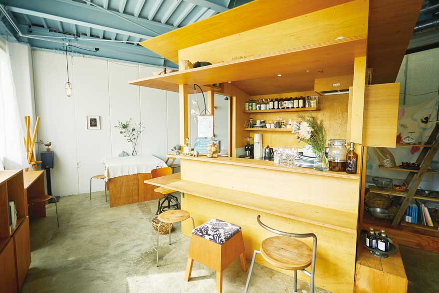 散歩の締めには、お酒も飲めるカフェへ。フロアにある屋根付きの小屋は厨房になっていて、カウンター席からは料理のライブ感も楽しめます。