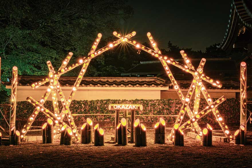 家康公が生まれたことで知られる岡崎城では、「竹灯り」のあたたかい和の光が灯ります。松應寺には家康公の父・松平広忠公が眠る御廟所があり、歴代将軍が参詣されていた逸話が。抽選で食事券が当たるデジタルスタンプラリーも実施しています。