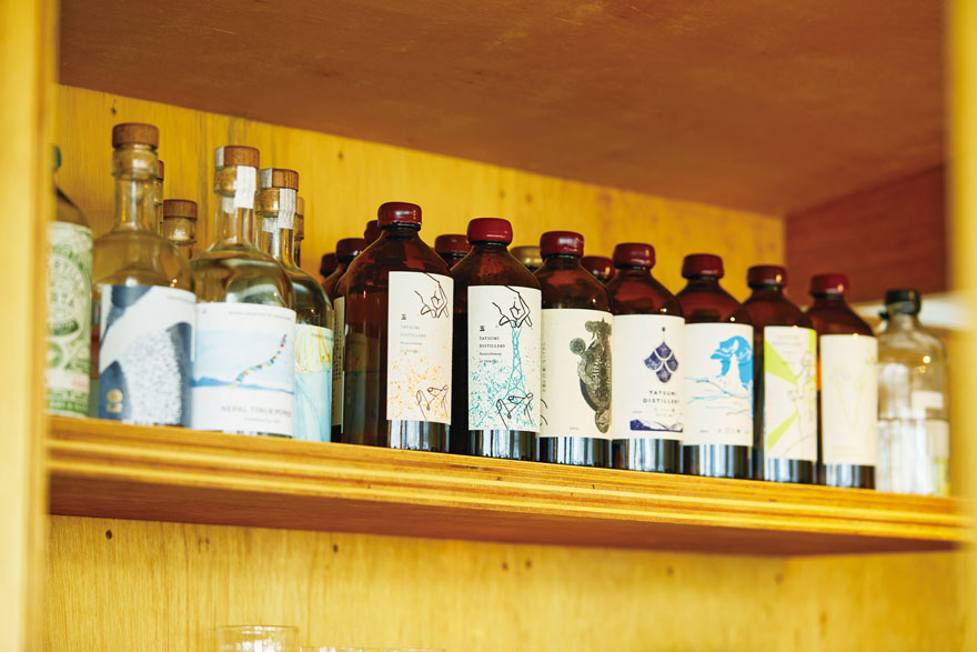 旅行好きな店主が旅先で出合った食材や酒が店に並ぶことも。豊富な種類の「国産クラフトジン」(500円〜)は15mlから試せるのがうれしい!