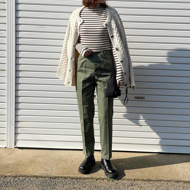 ケーブル編みがカジュアルな印象のカーディガンは、袖を通さず肩掛けすると垢抜けますよ!