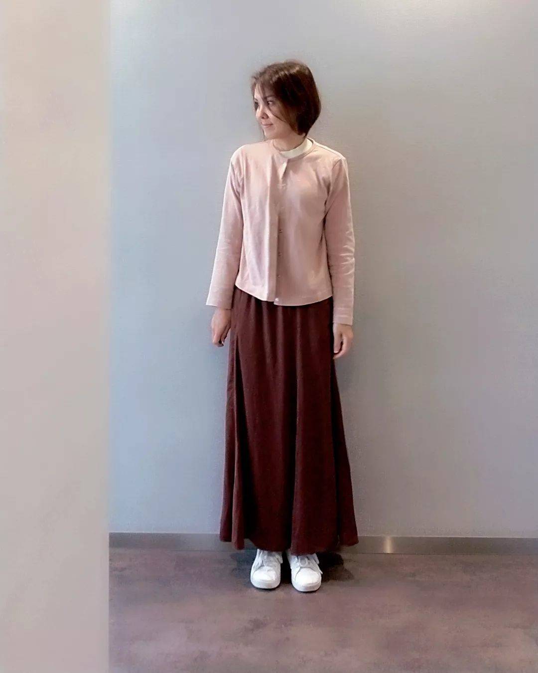 ピンクのカーディガンとブラウンのスカートの組み合わせは女性らしく見えるうえに華やかで、垢抜けて見えますよ。