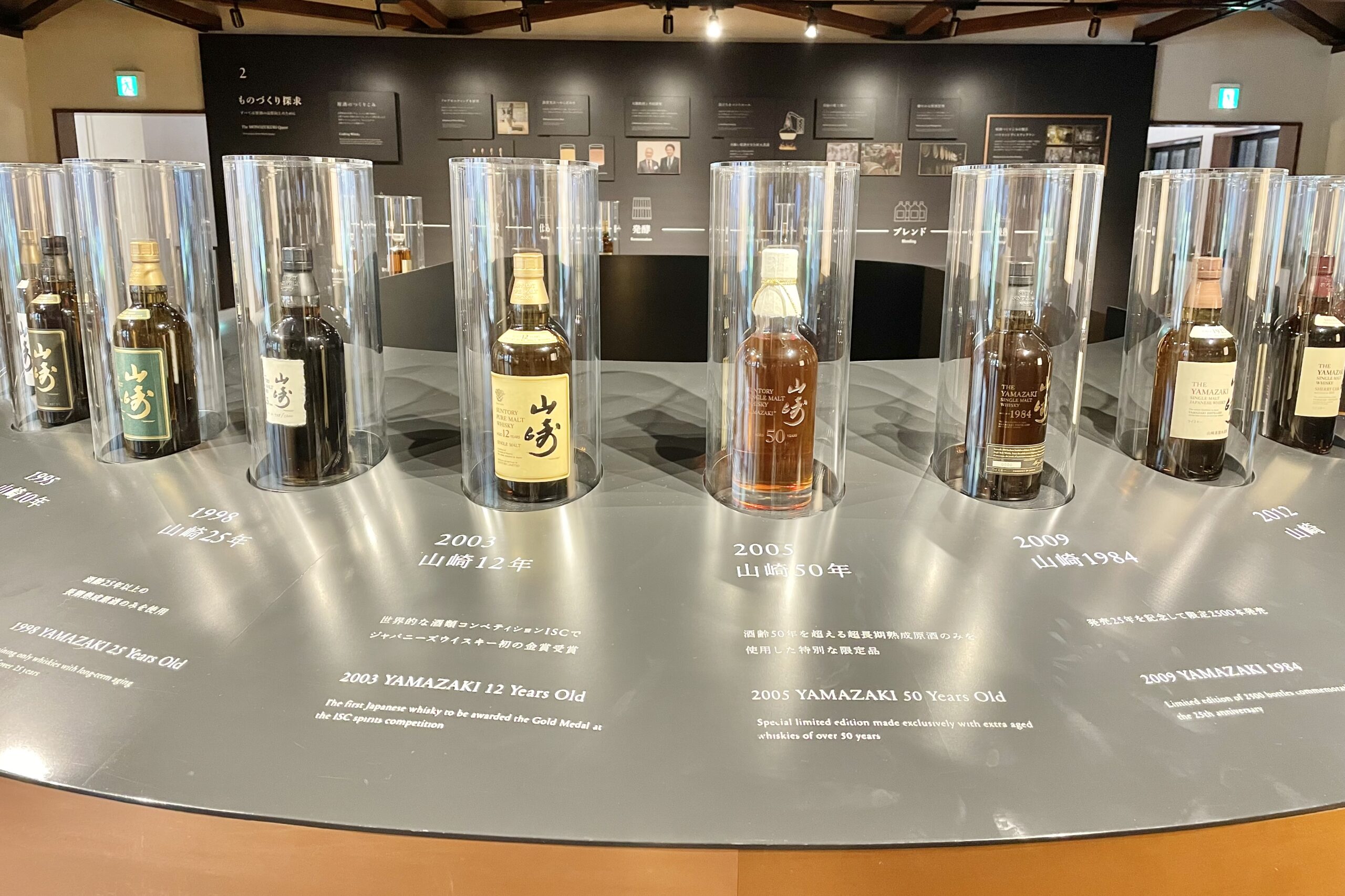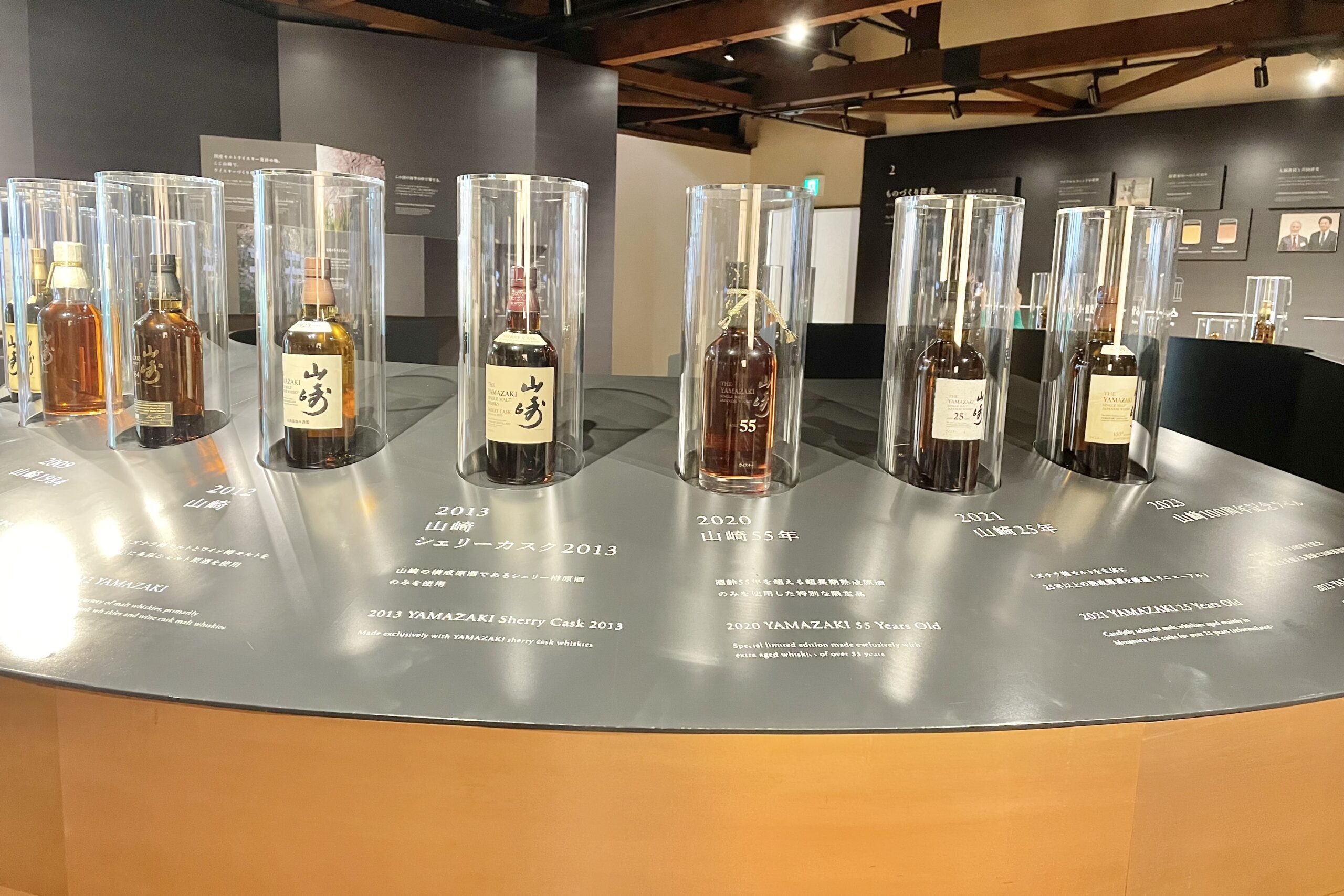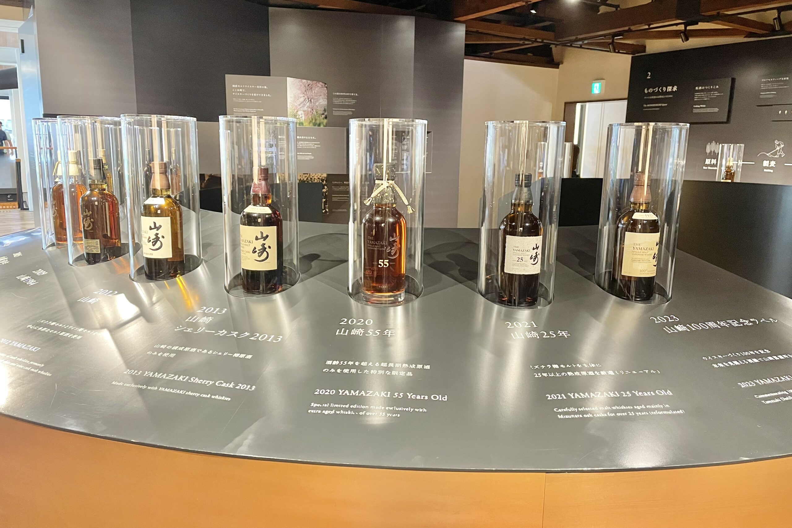 中央には1984年発売の初代「山崎」から、2023年の100周年記念ラベルまで、歴代のボトルがずらりと並び圧巻です。