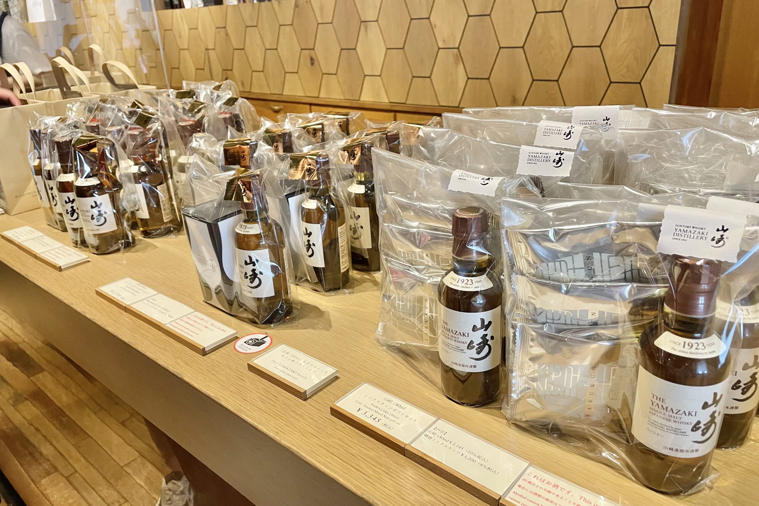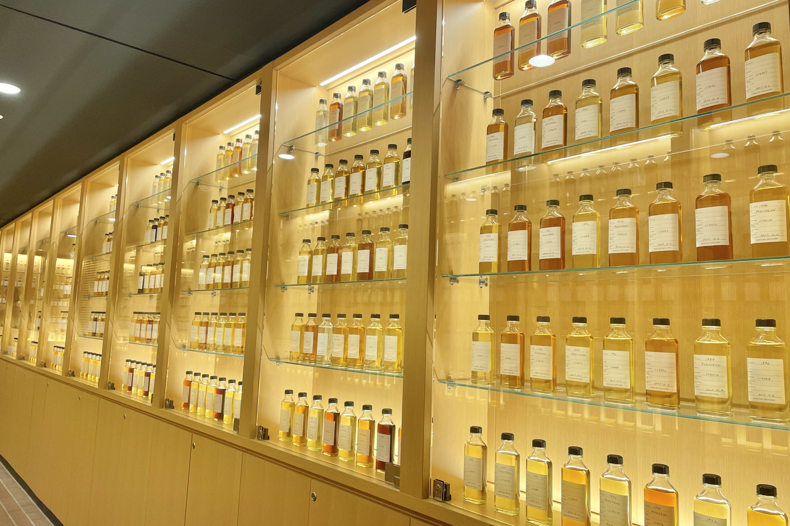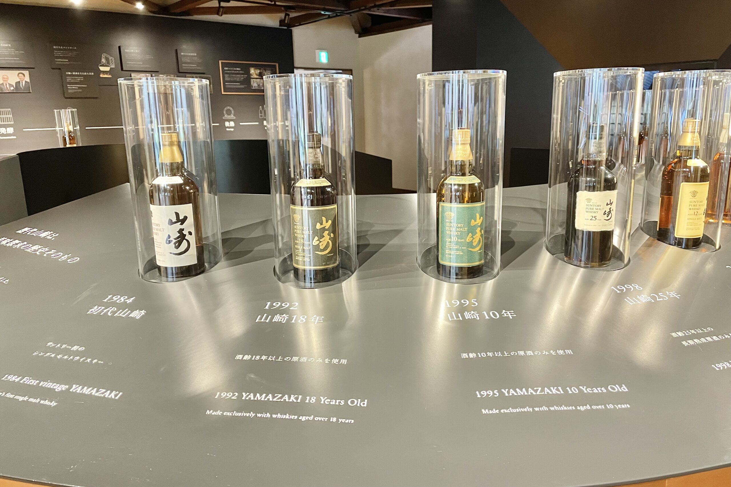 中央には1984年発売の初代「山崎」から、2023年の100周年記念ラベルまで、歴代のボトルがずらりと並び圧巻です。